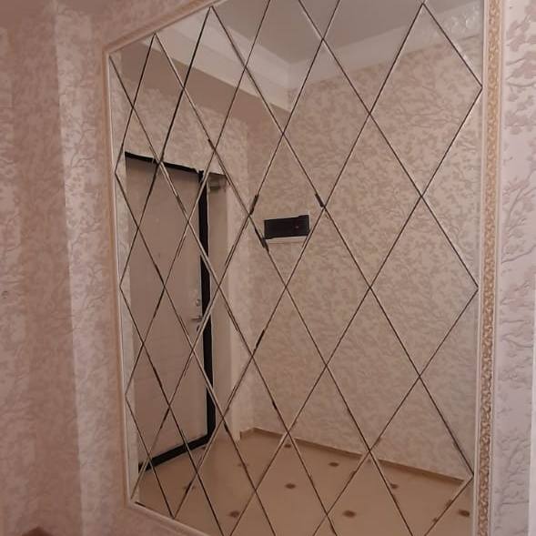 Использована серебристая квадратная зеркальная плитка размером 18х18.
