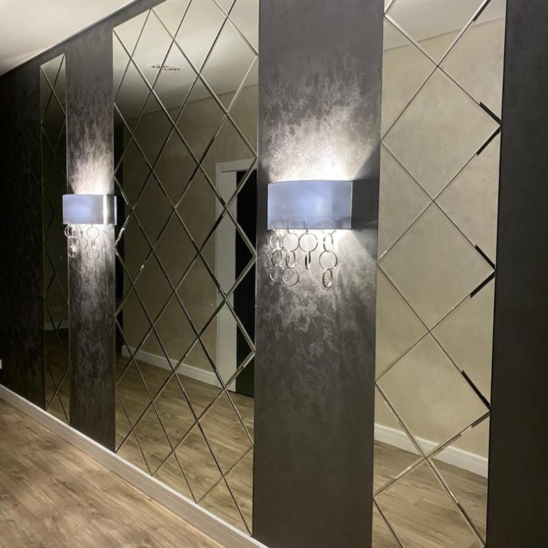 Представленные зеркальные панно расположены не просто в коридоре, а в коридоре с темными стенами, что еще более зрительно сужает пространство. Тяжеловесный интерьер просто нуждается в чем-то, чтобы разбавить и облегчить его. И, надо казать, зеркальные панно вполне справляются со своей задачей. ⠀