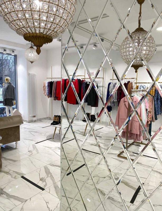 Использована квадратная серебристая зеркальная плитка размером 18х18.